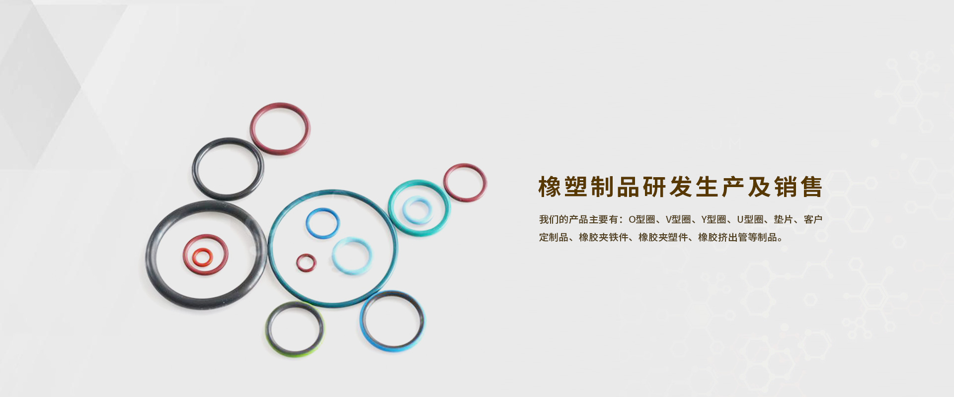 O型圈、V型圈、Y型圈、U型圈、墊片、客戶定制品、橡膠夾鐵件、橡膠夾塑件、橡膠擠出管等制品。